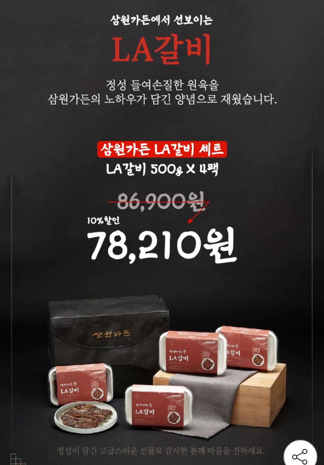 [지마켓] 삼원가든 LA갈비 선물세트 (500g x 4팩) (카드 74,300원/무료) > 국내핫딜
