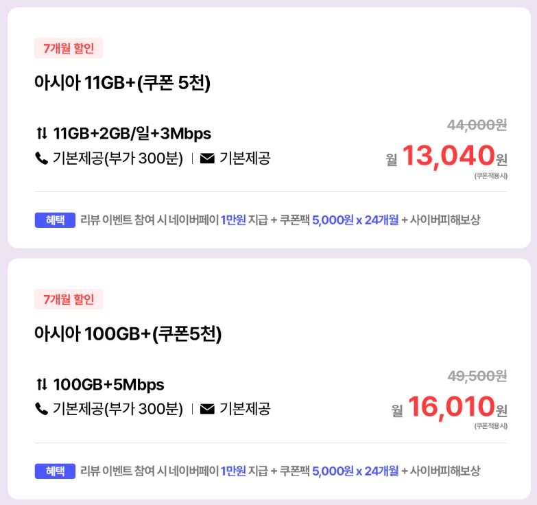 [아시아모바일] 알뜰폰 데이터 71GB+3MBps, 음성/문자 무제한 (월 13,040원/배송비 무료)