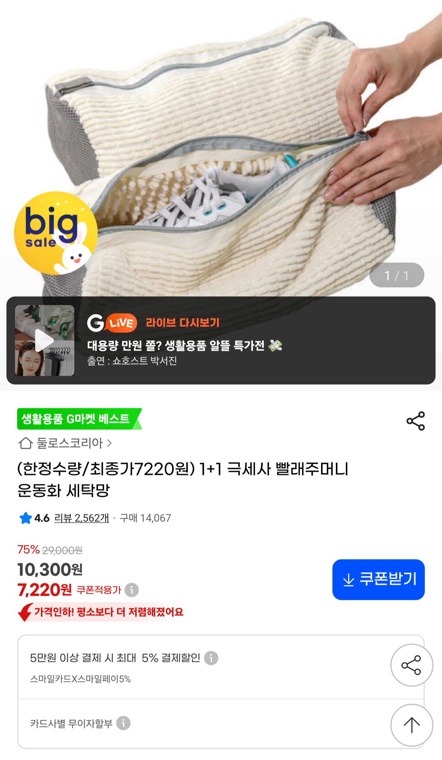 [지마켓] 1+1 극세사 빨래주머니 운동화 세탁망 (7,220원/무료)