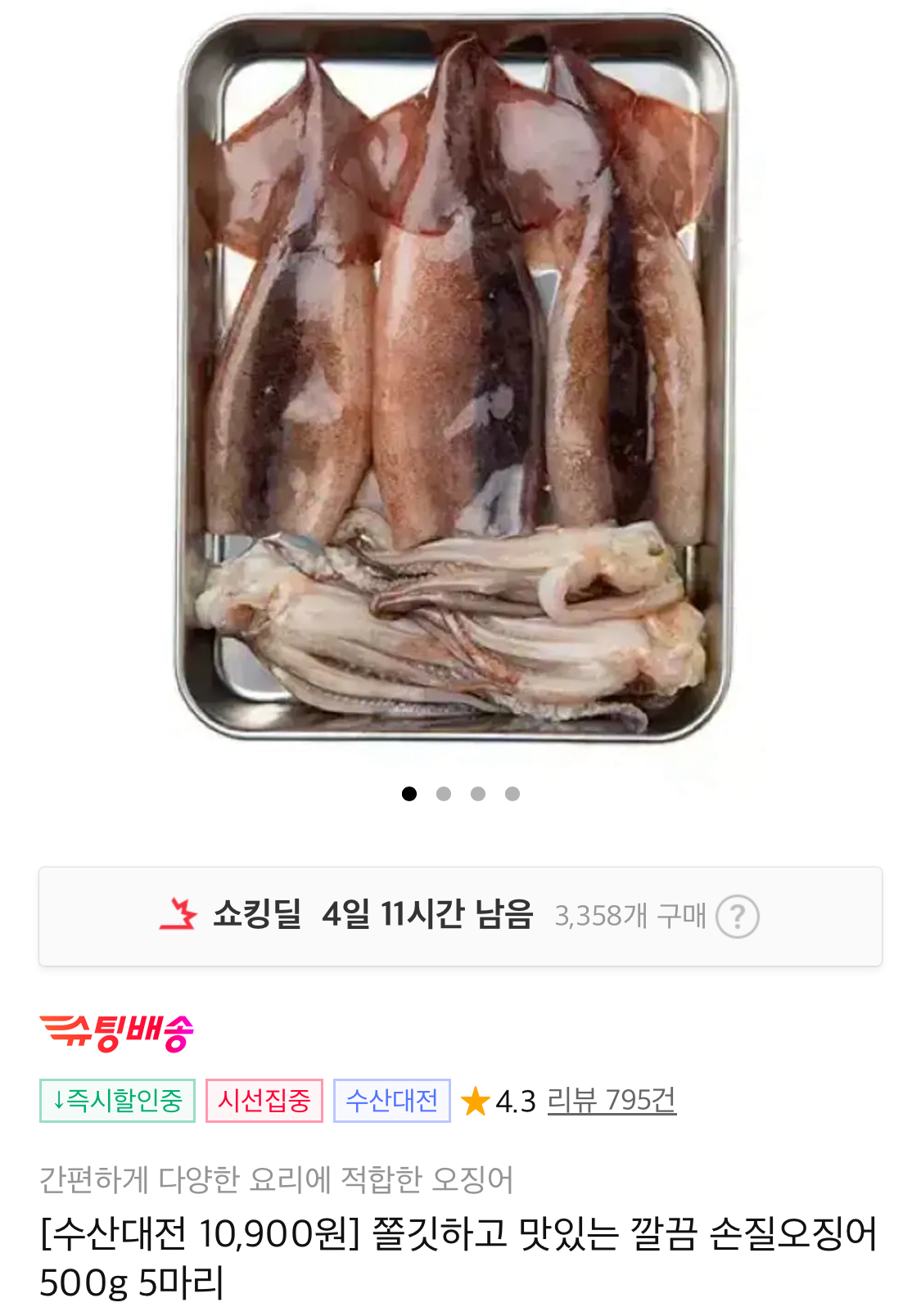 [11번가] 쫄깃하고 맛있는 깔끔 손질오징어 500g 5마리 (10,900원/무료)