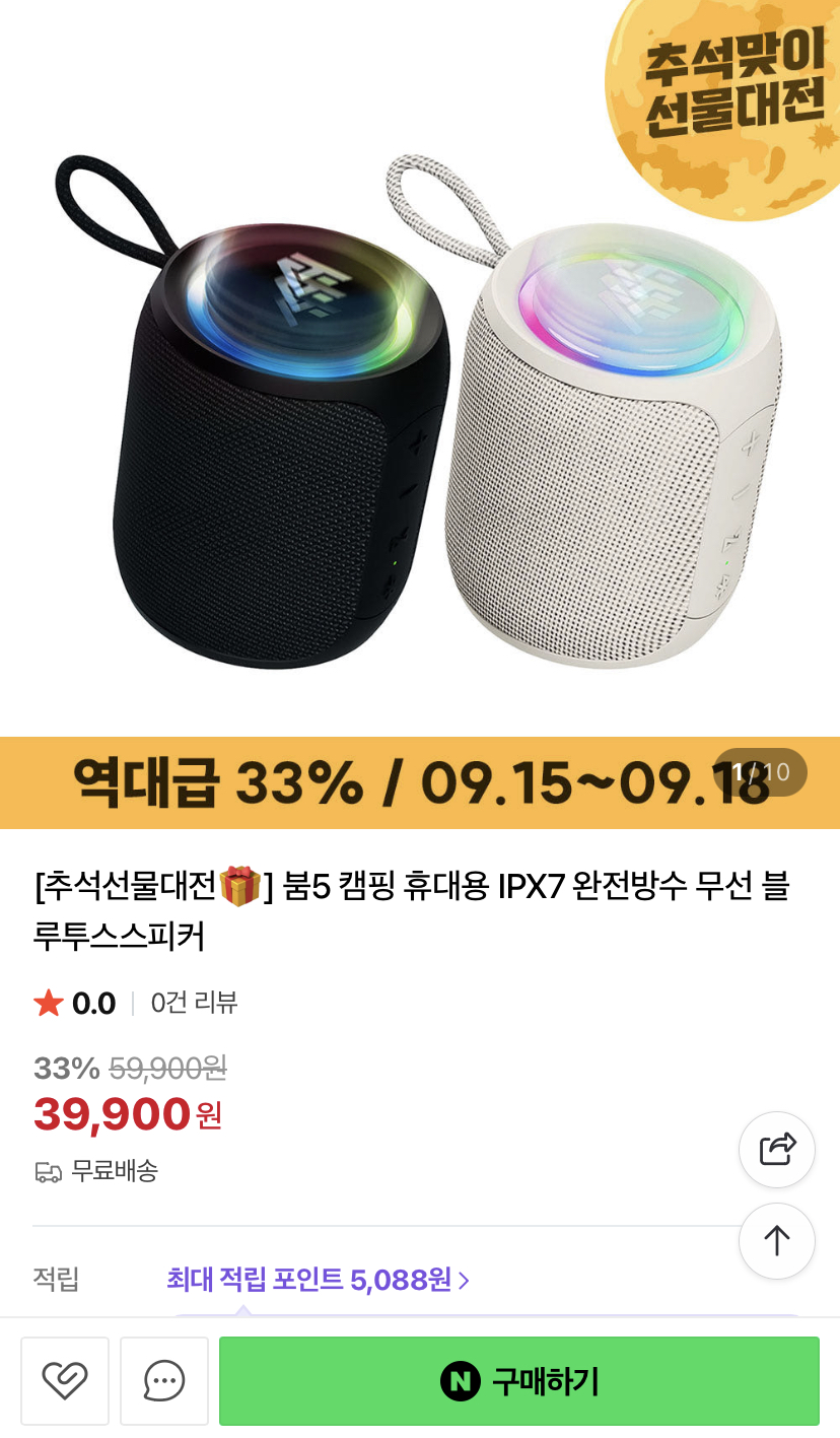 [네이버]붐5 캠핑 휴대용 IPX7 완전방수 무선 블루투스스피커(39,900원/무료)