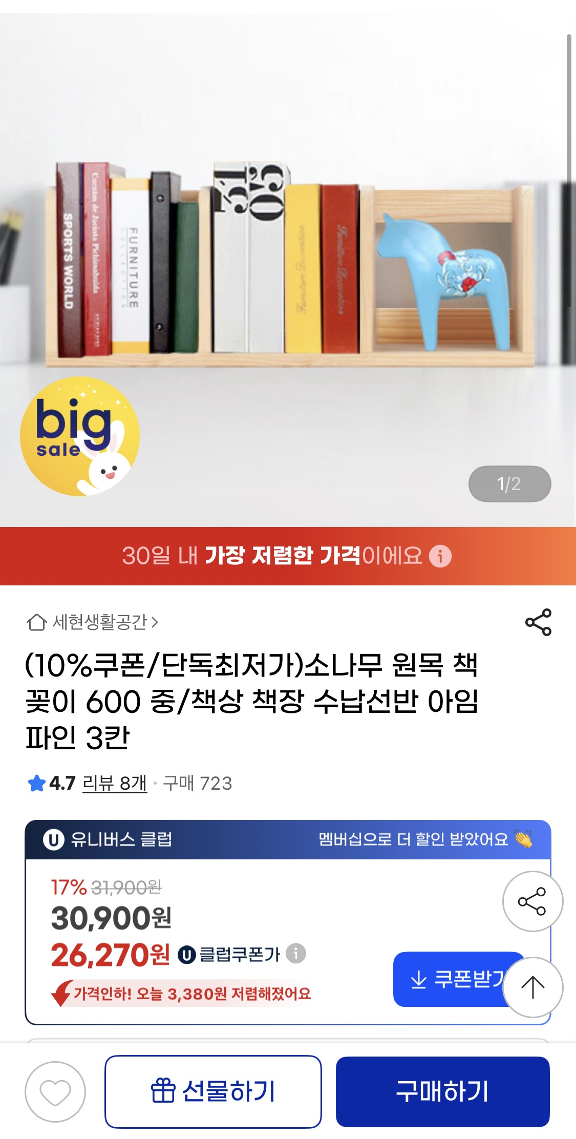 [지마켓] 소나무 원목 책꽂이 600사이즈 3칸 (26,270원/무배)