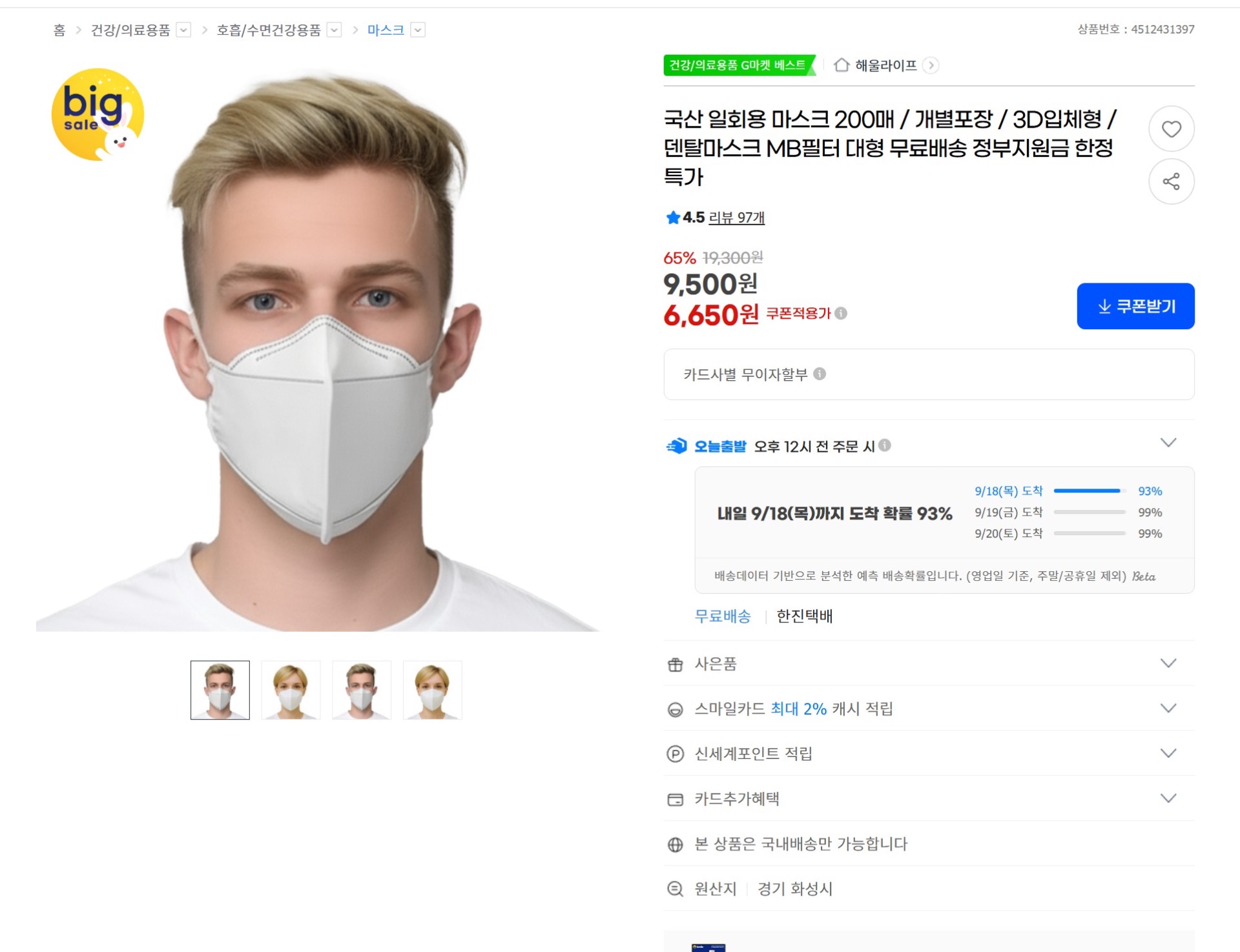 [지마켓] 개별포장 국산 일회용 마스크 200매 (6,650원/무배)