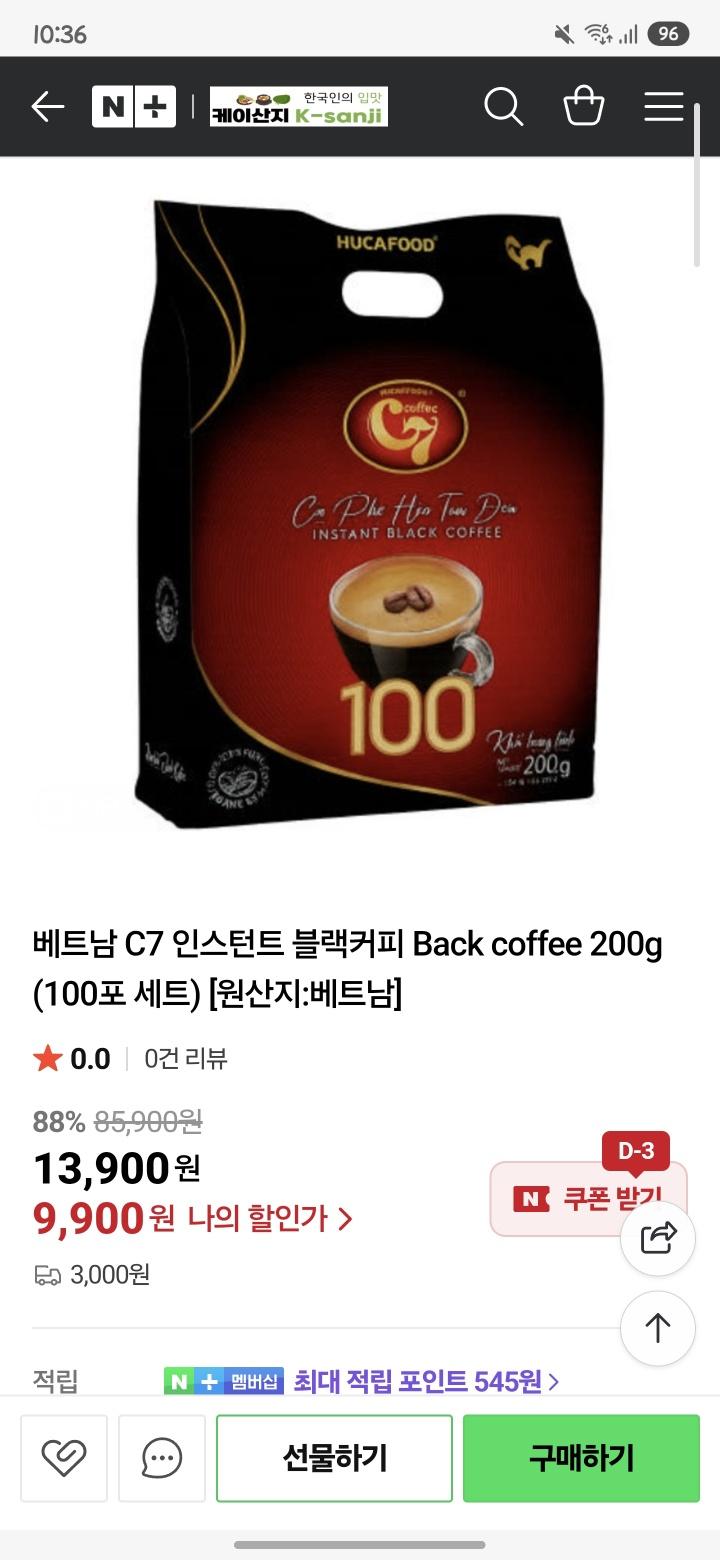 [네이버] 출시 한정이벤트 베트남C7블랙커피 대용량 100스틱 핫딜 쿠폰 적용 必 (9,900원/3000원) > 국내핫딜