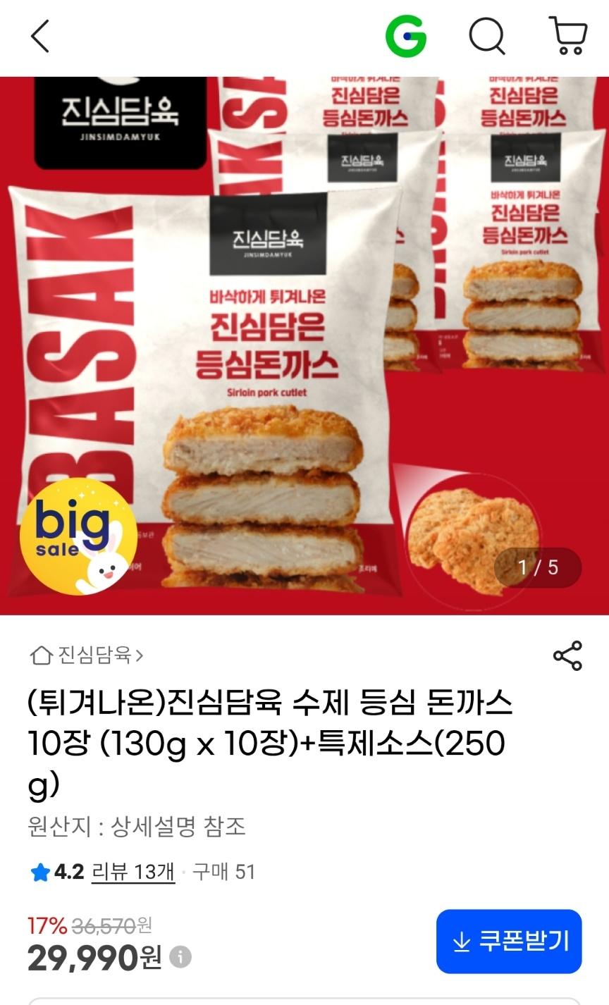[지마켓] 바삭하게 튀겨나온 진심담육 수제 통등심돈까스 10장 +특제소스 (29,990원/무료) > 국내핫딜