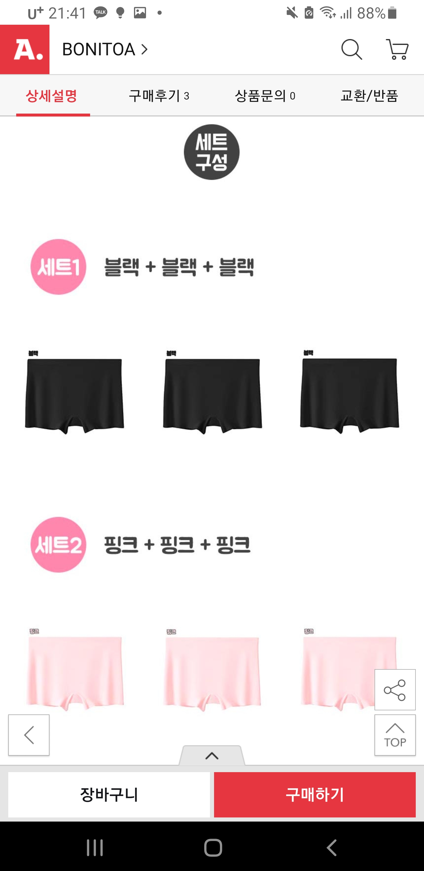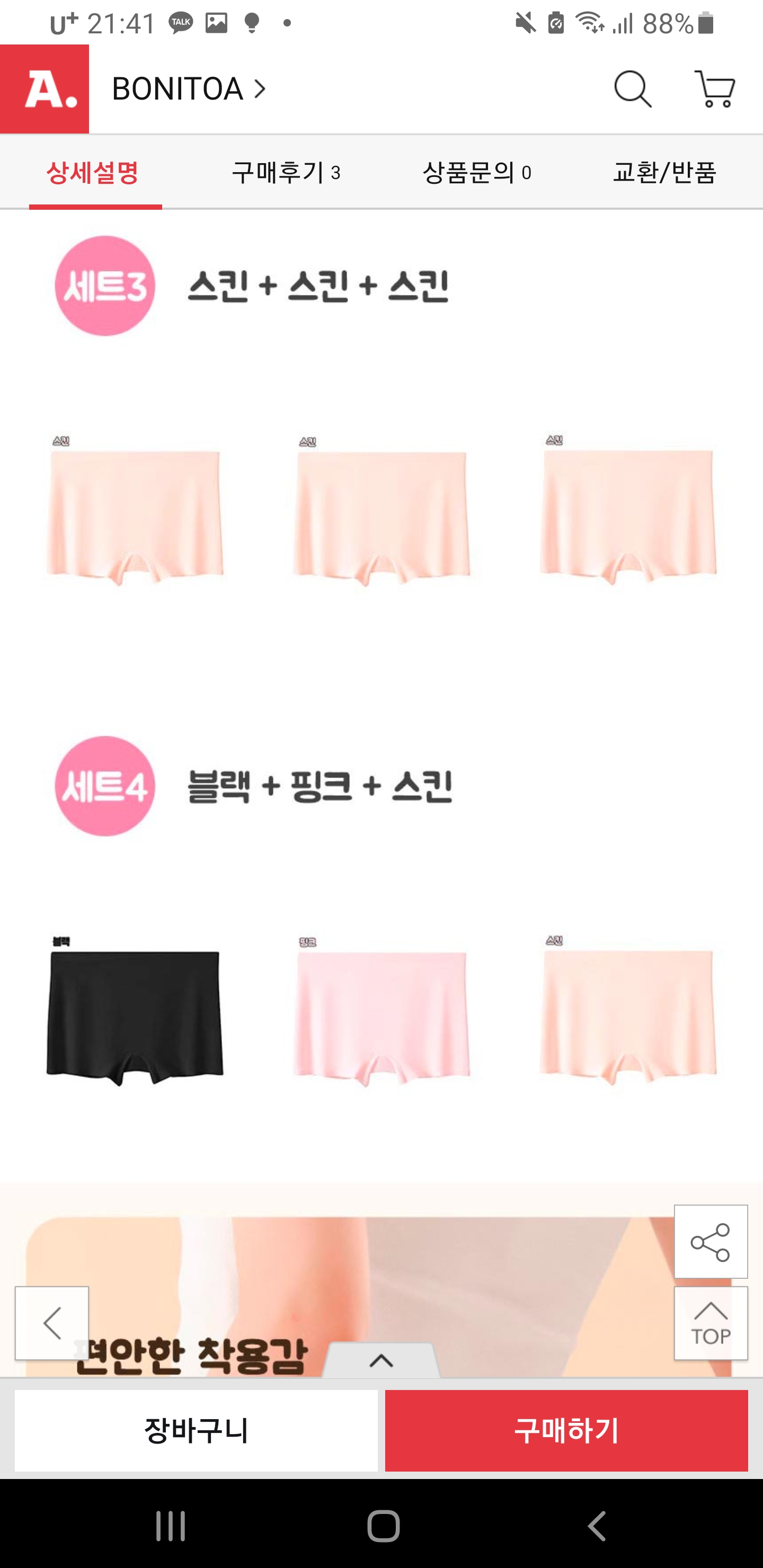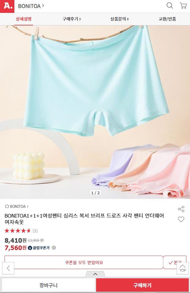 여성용 심리스 사각팬티 3장에 유클가 7560원 무배면 가성비 괜찮네요