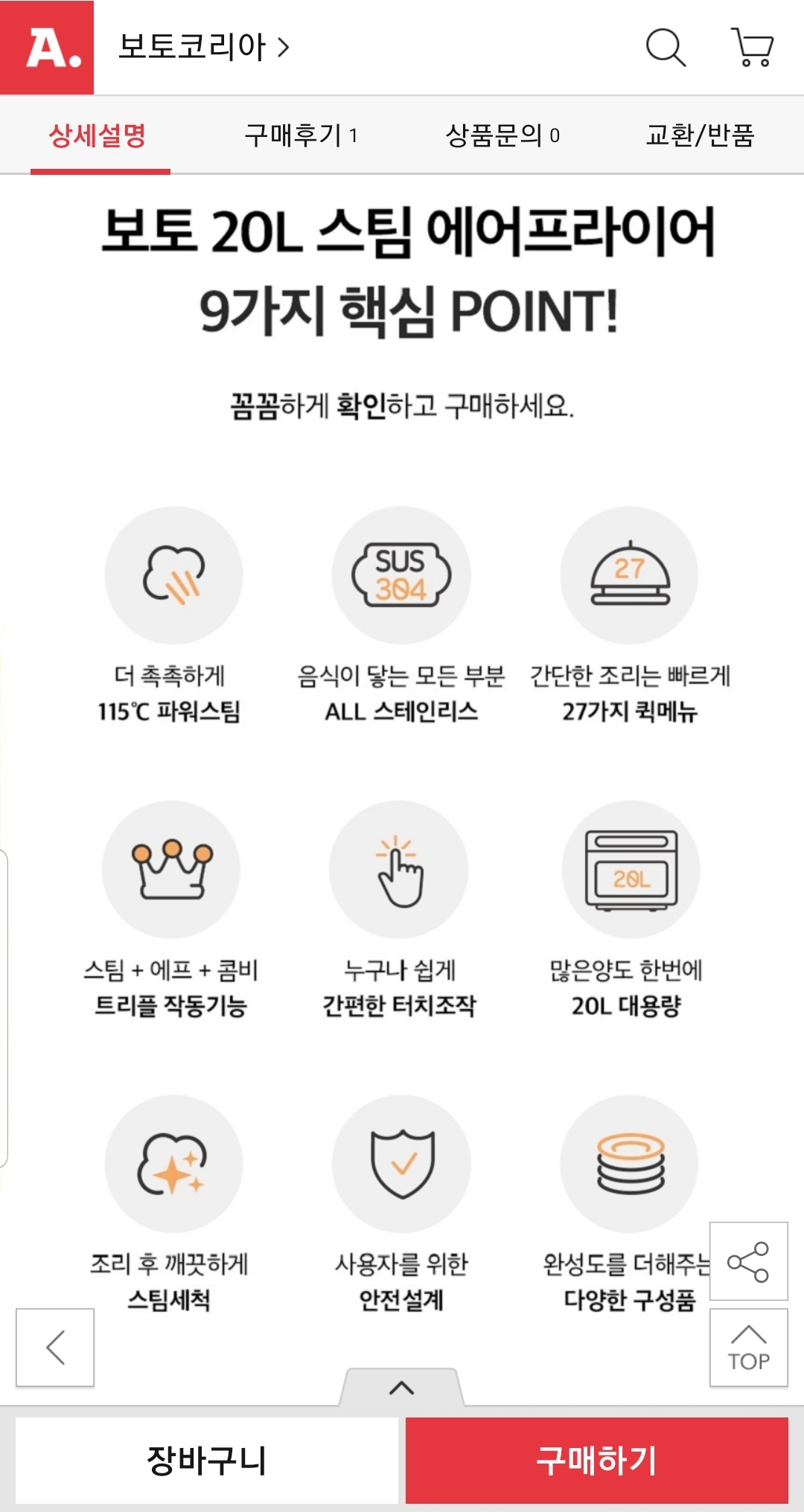 [옥션] 스팀 에어프라이어 20L 대용량 (308,480원/무료) > 국내핫딜