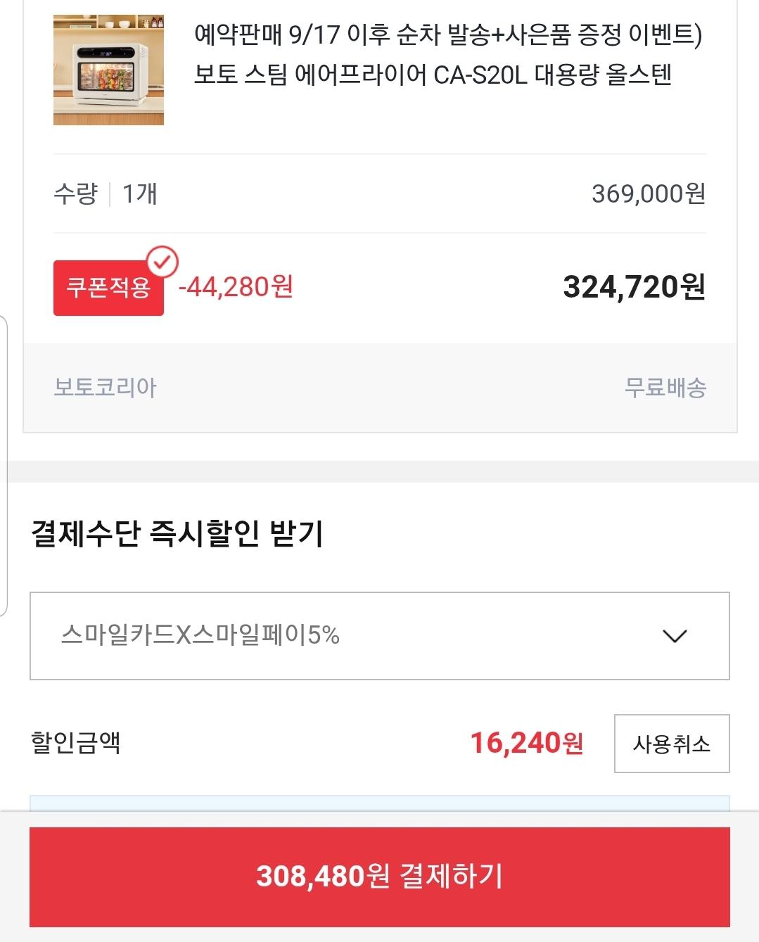 [옥션] 스팀 에어프라이어 20L 대용량 (308,480원/무료)