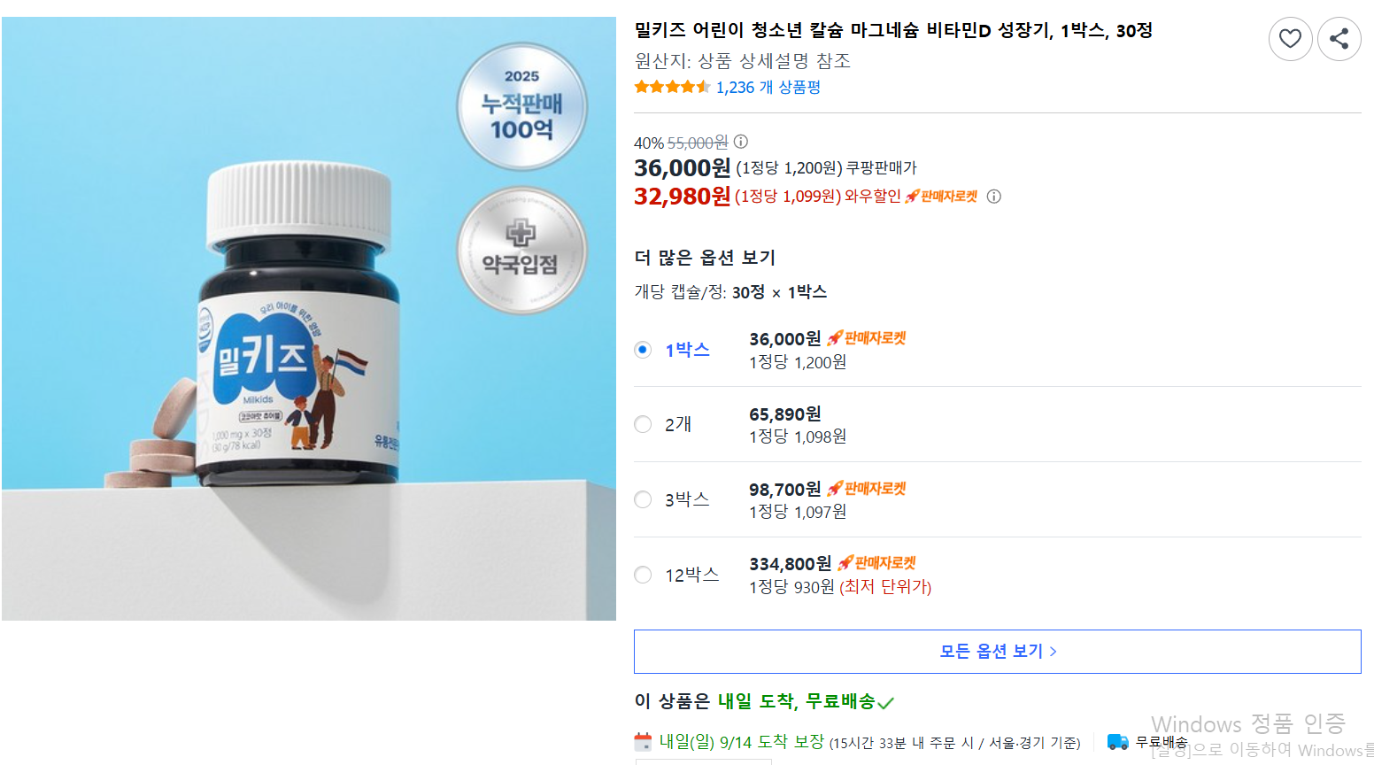 [쿠팡] 밀키즈 키 성장 영양제 (33,120원/무배)
