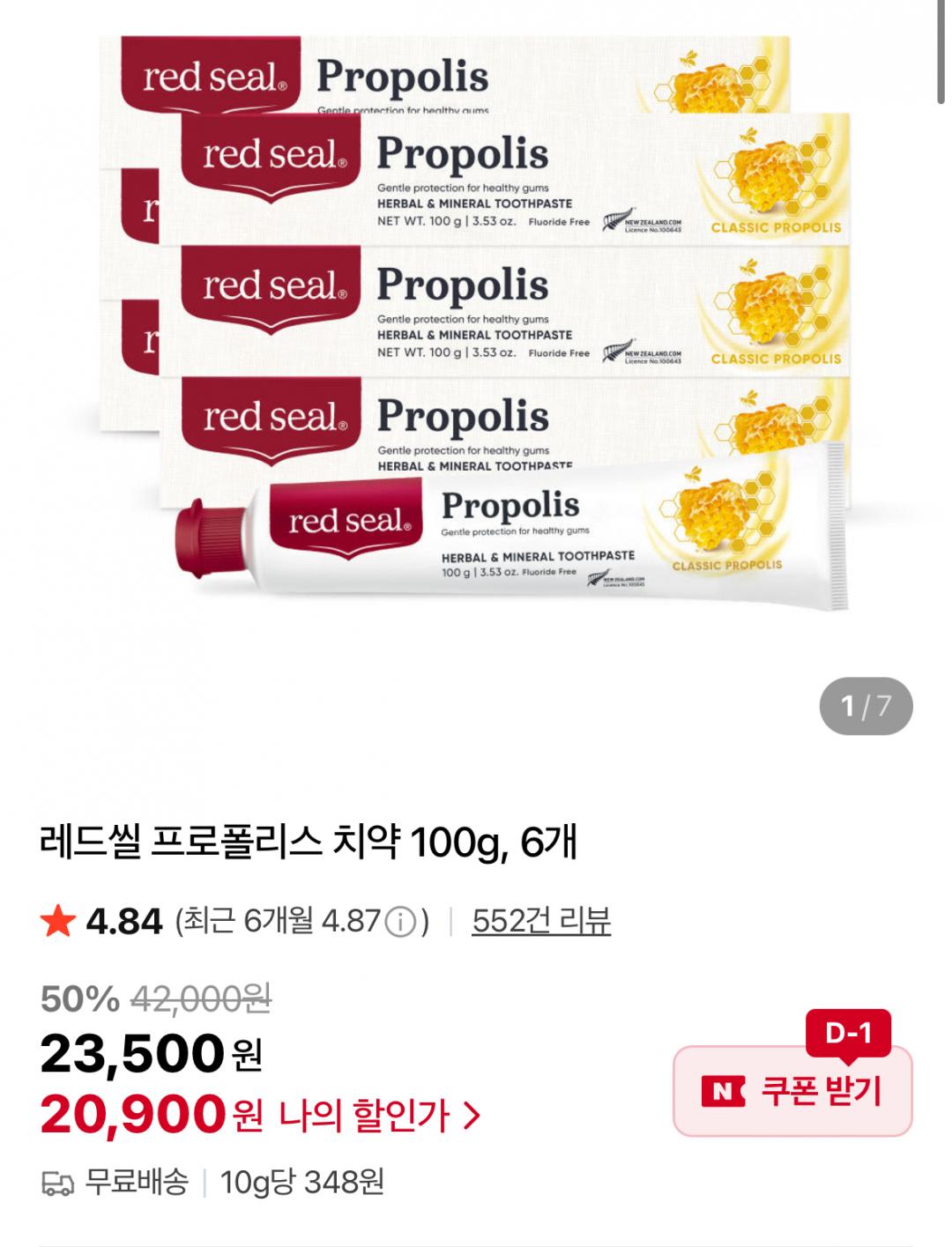 [네이버] 레드씰 프로폴리스 치약 100g 6개 (20,900원/무료)