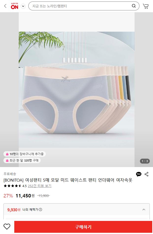 [롯데온] 편안한 여성 팬티 5매입 (9930원/무료)