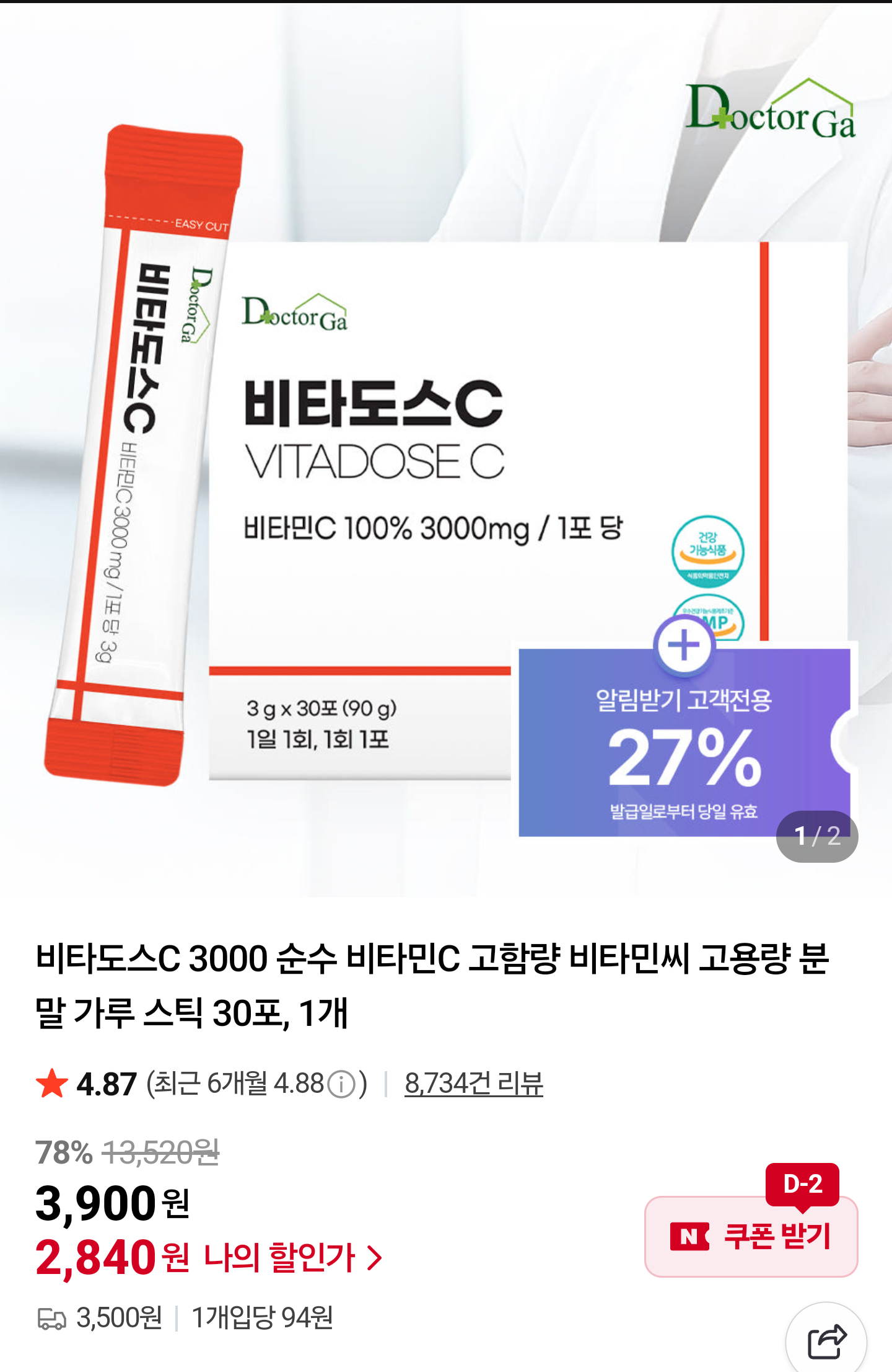 [네이버] 비타도스C 고함량 분말가루 스틱 30포 (2,840원/네멤무배)