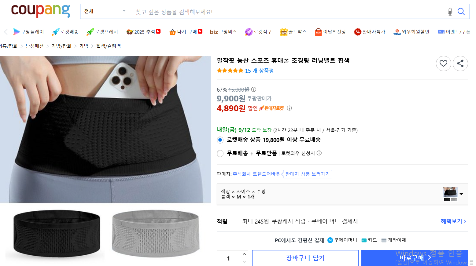 쿠팡)스포츠 경량 러닝밸트 4,890원