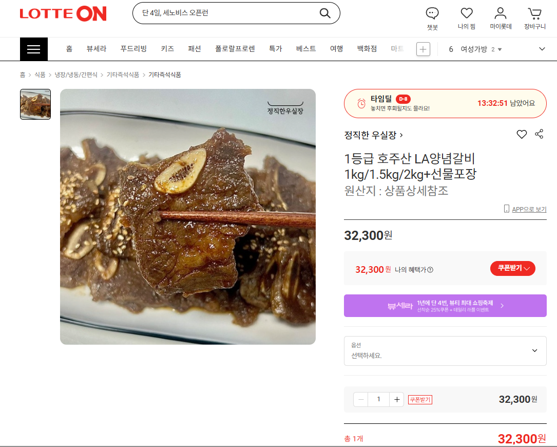 롯데온)1등급 호주 청정우 LA양념갈비 1kg 32,300원/무배