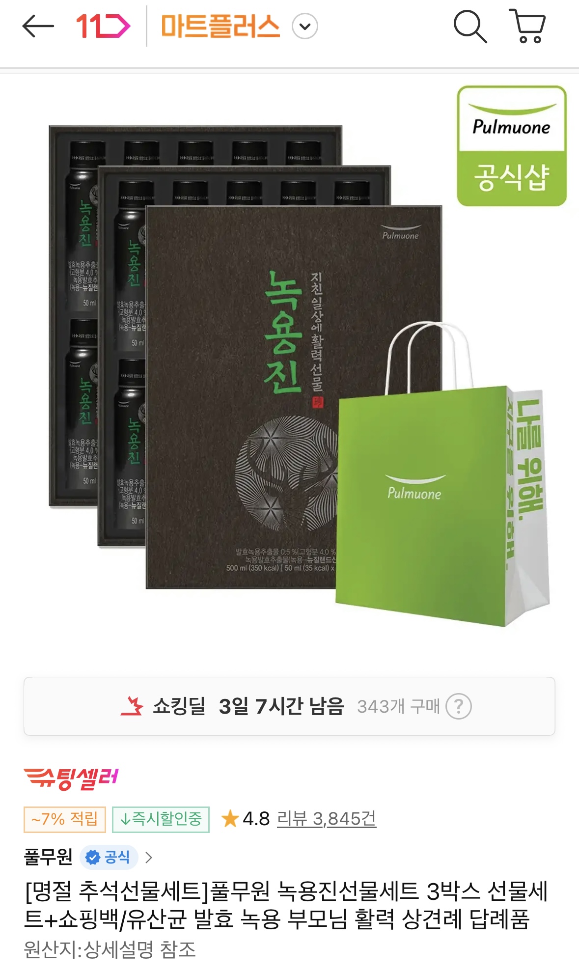 [11번가] 풀무원 녹용진선물세트 3박스+쇼핑백 (49,900원/무료)