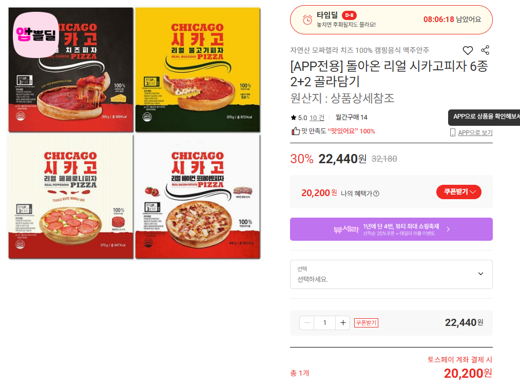 [롯데온] 리얼 시카고피자 6종 2+2골라담기 20,200원/무배