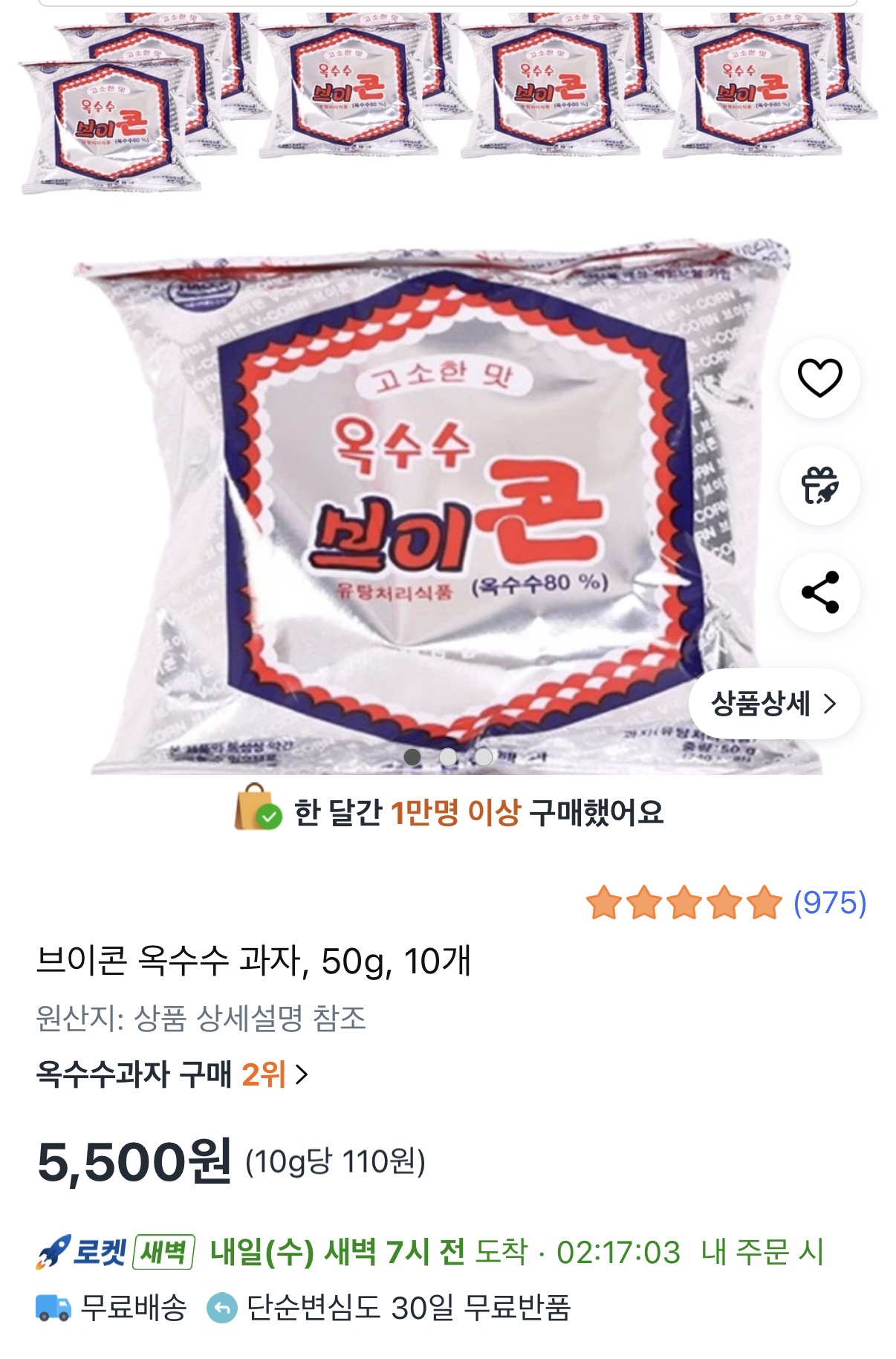 [쿠팡] 브이콘 옥수수 과자 50g 10개 (5,500원/와우무료)