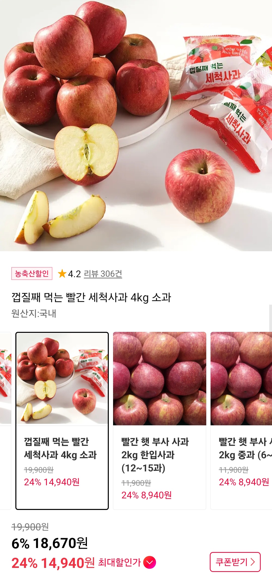[11번가] 껍질째 먹는 빨간 세척사과 4kg 소과 (14,940원/무배)