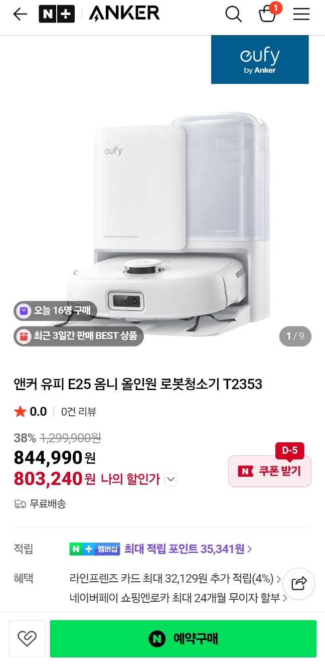 [네이버] 앤커 유피 E25 옴니 올인원 로봇청소기 T2353 (803,240원/무료)