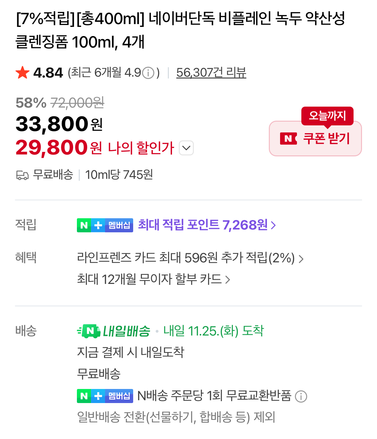 [네이버] 비플레인 녹두 약산성 클렌징폼 100ml 4개 (29,800원/무배)