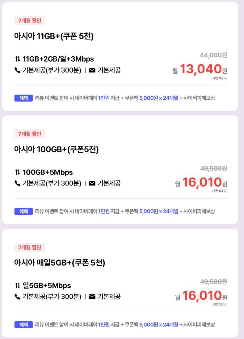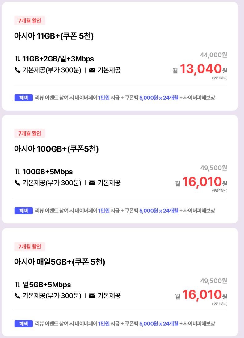 [아시아모바일] 데이터 150GB+5Mbps / 네이버페이 12만원 (배송비 무료) > 국내핫딜
