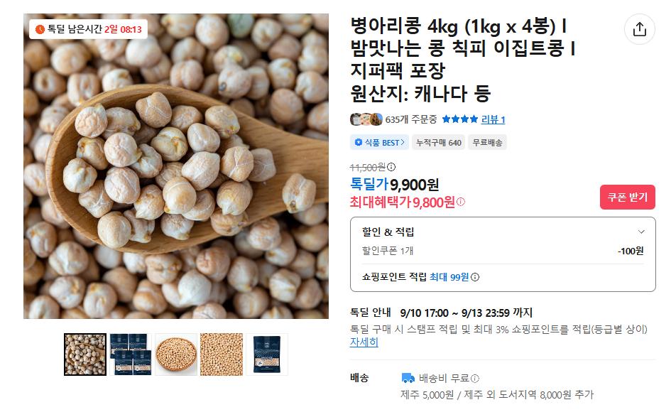 톡딜)병아리콩 1kg 4봉 9,900원/무배 > 국내핫딜