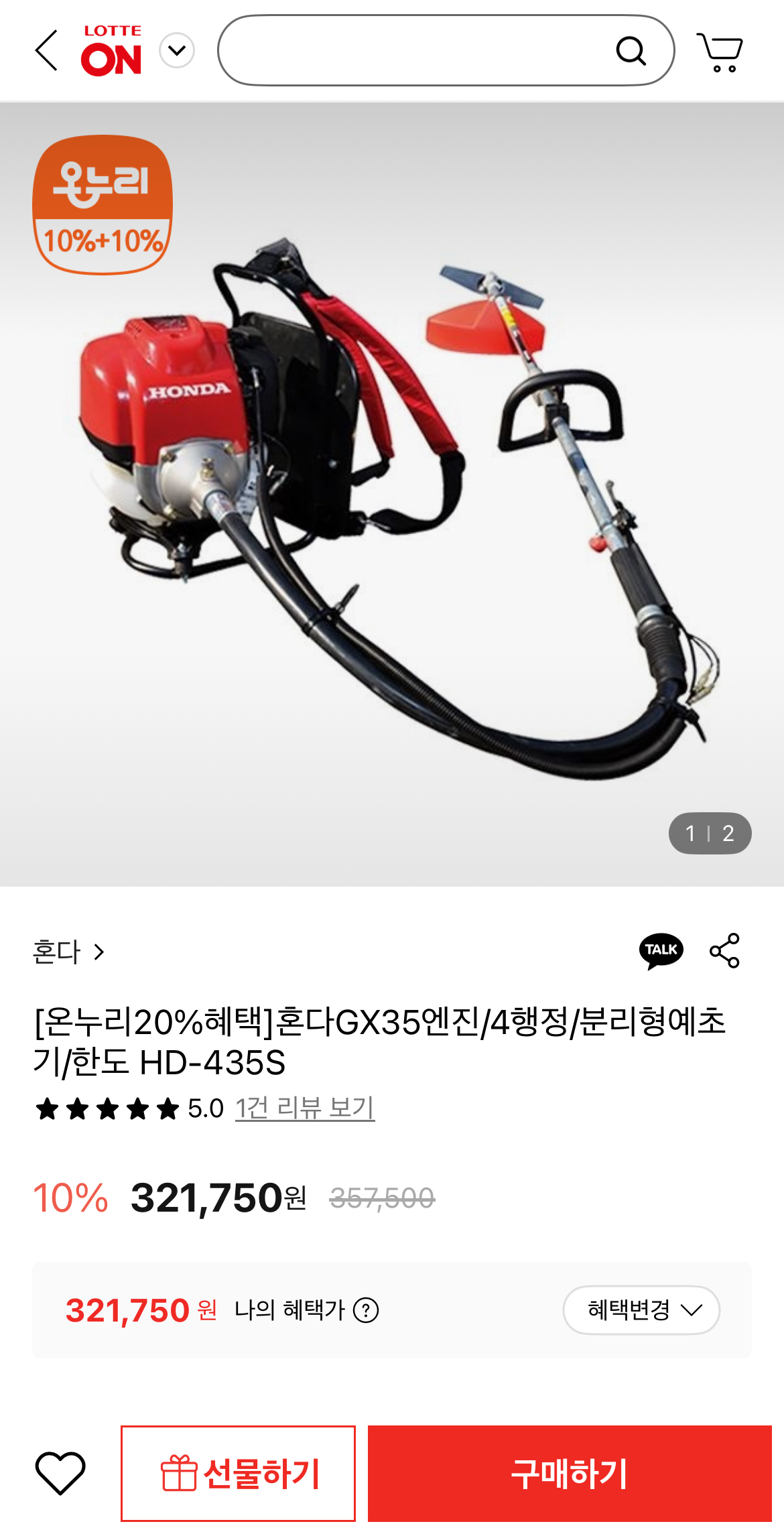 [롯데온] 혼다 GX35엔진 4행정 분리형예초기 한도 HD-435S (321,750원/무료)
