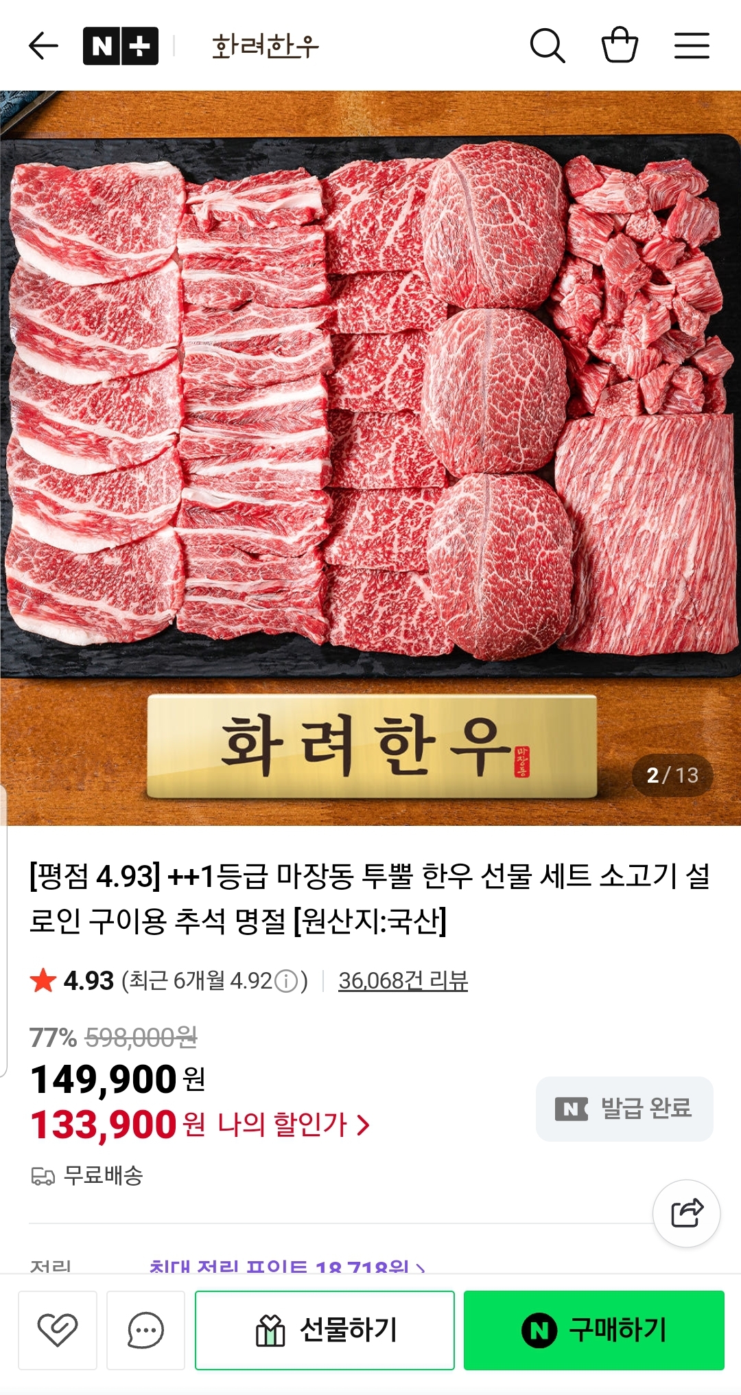 [네이버] 투쁠 한우 한 세트 1.3kg 등심,갈비,차돌,불고기,국거리,등심 (133,900원/무료)