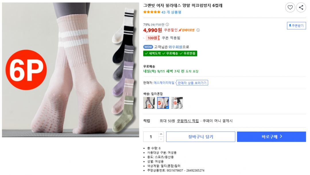 쿠팡)여자 필라테스 양말 6켤레 4,990원