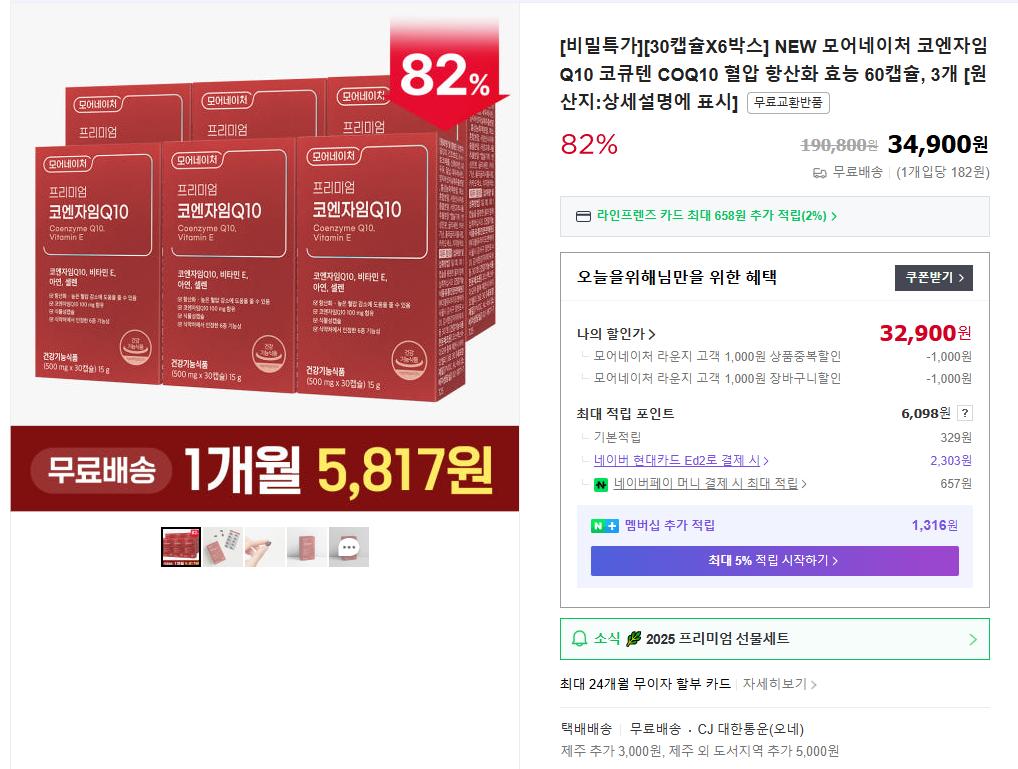 네이버) 코엔자임 Q10 30캡슐×6개월분 32,900원