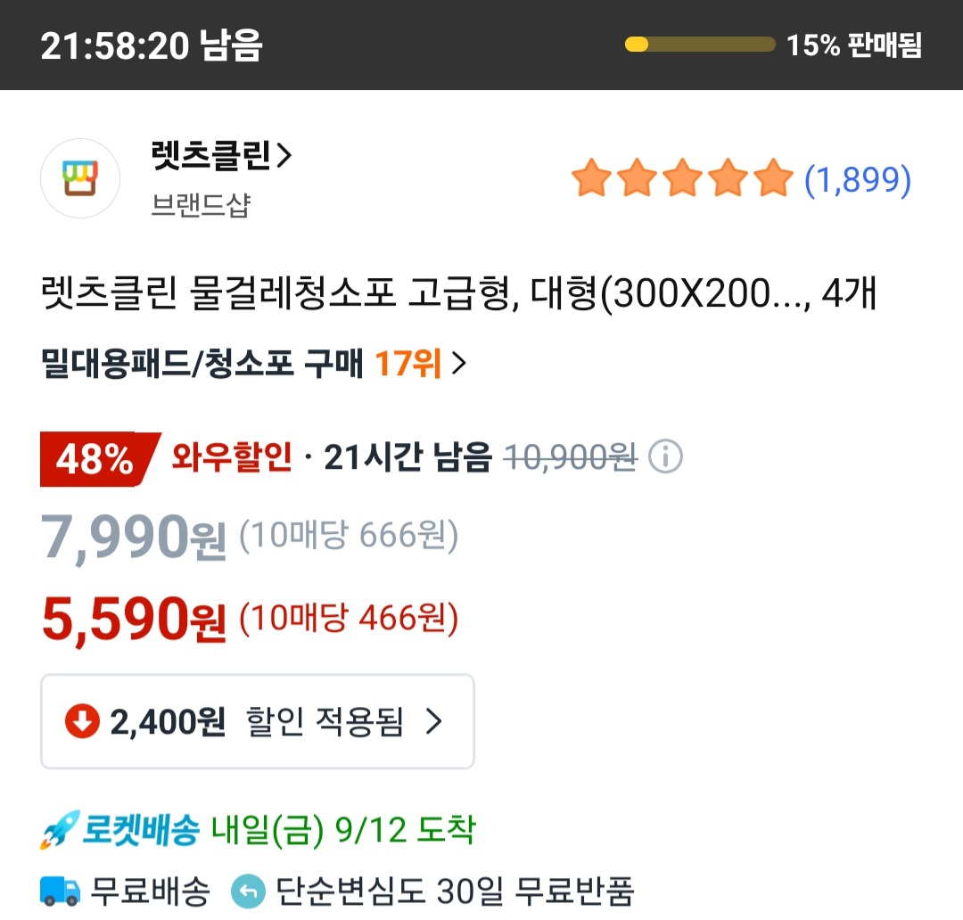 [쿠팡] 렛츠클린 물걸레 청소포 4팩(대형)(5,590원) > 국내핫딜