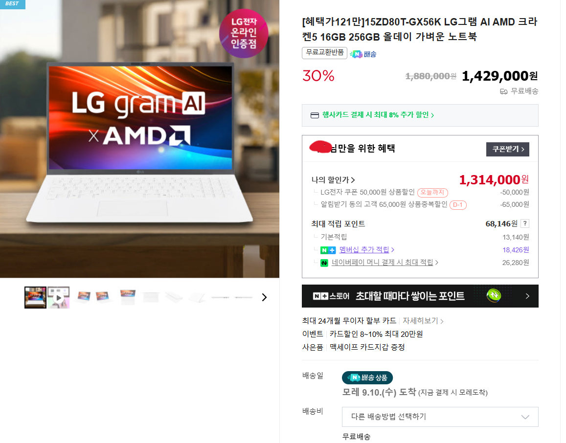 [네이버] LG그램 15ZD80T-GX56K (1,182,600원 / 무료)