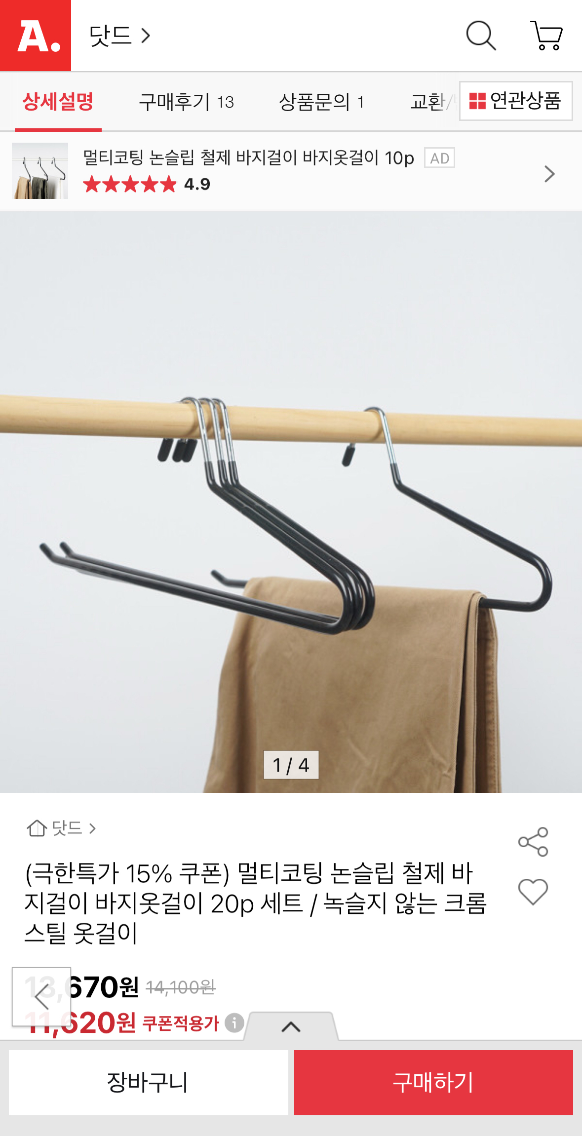 [지마켓] 논슬립 철제 크롬스틸 바지걸이 20개 (11,620원/무료)