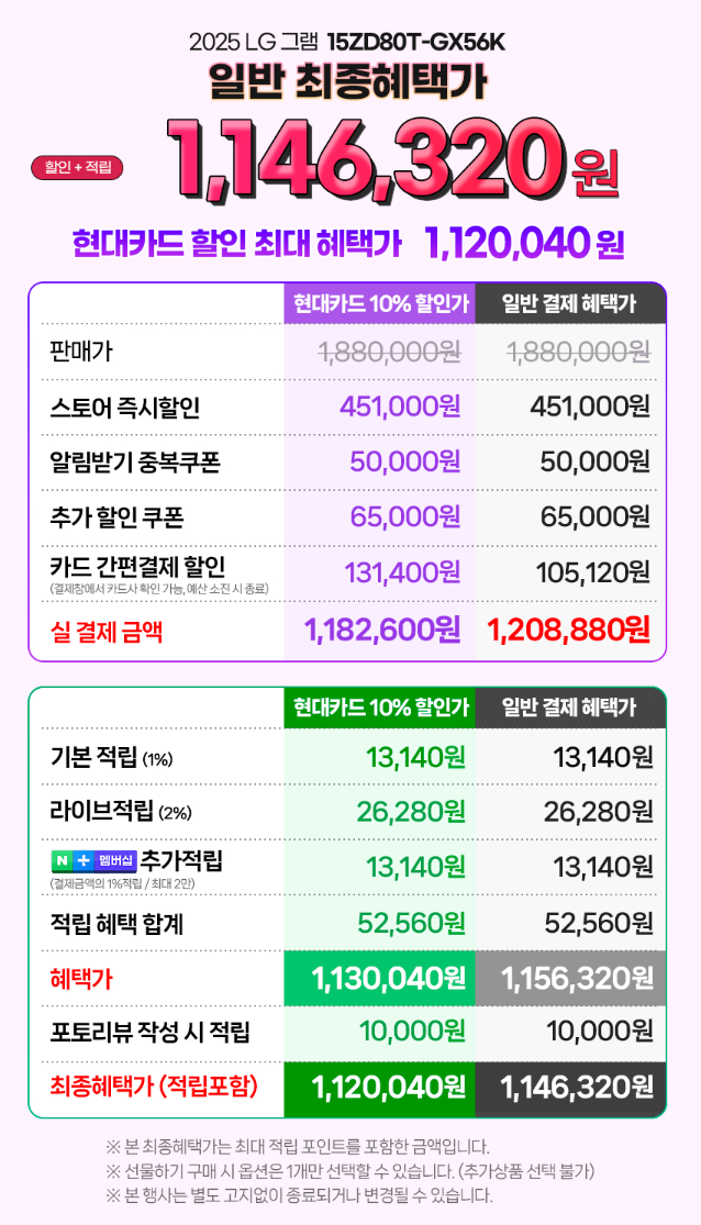 쿠폰 2종에 네이버 현대카드로 결제해야 118만원대 나옵니다.