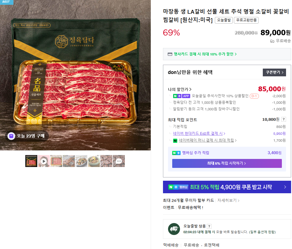 [네이버] 68% 할인! 마장동 LA갈비 선물 세트 (89,000원/ 무료배송)