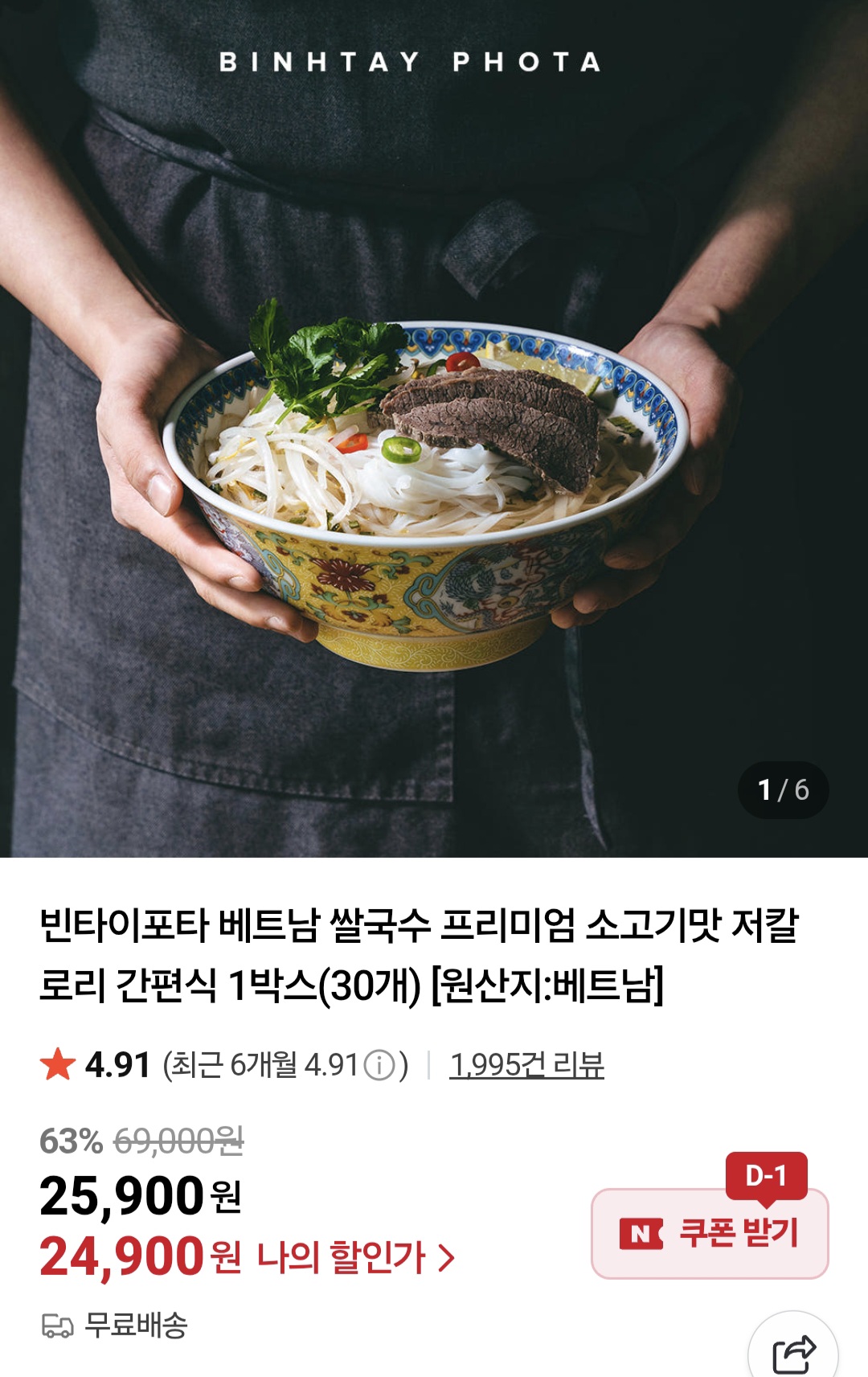 [네이버] 빈타이포타 소고기맛 베트남 쌀국수 1박스(30개) (24,900원/무료)