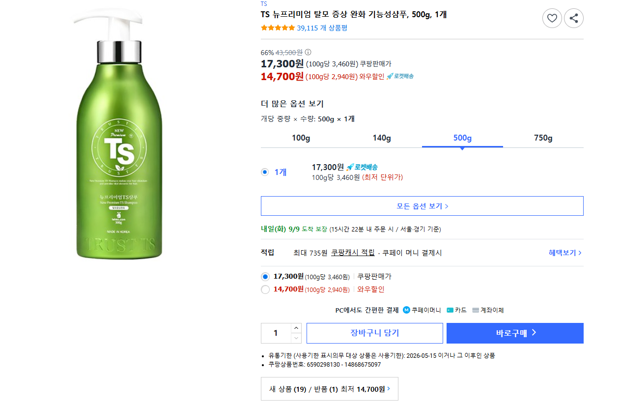 [쿠팡] TS 뉴프리미엄 탈모 증상 완화 기능성샴푸, 500g, 1개 (14,700/무배)