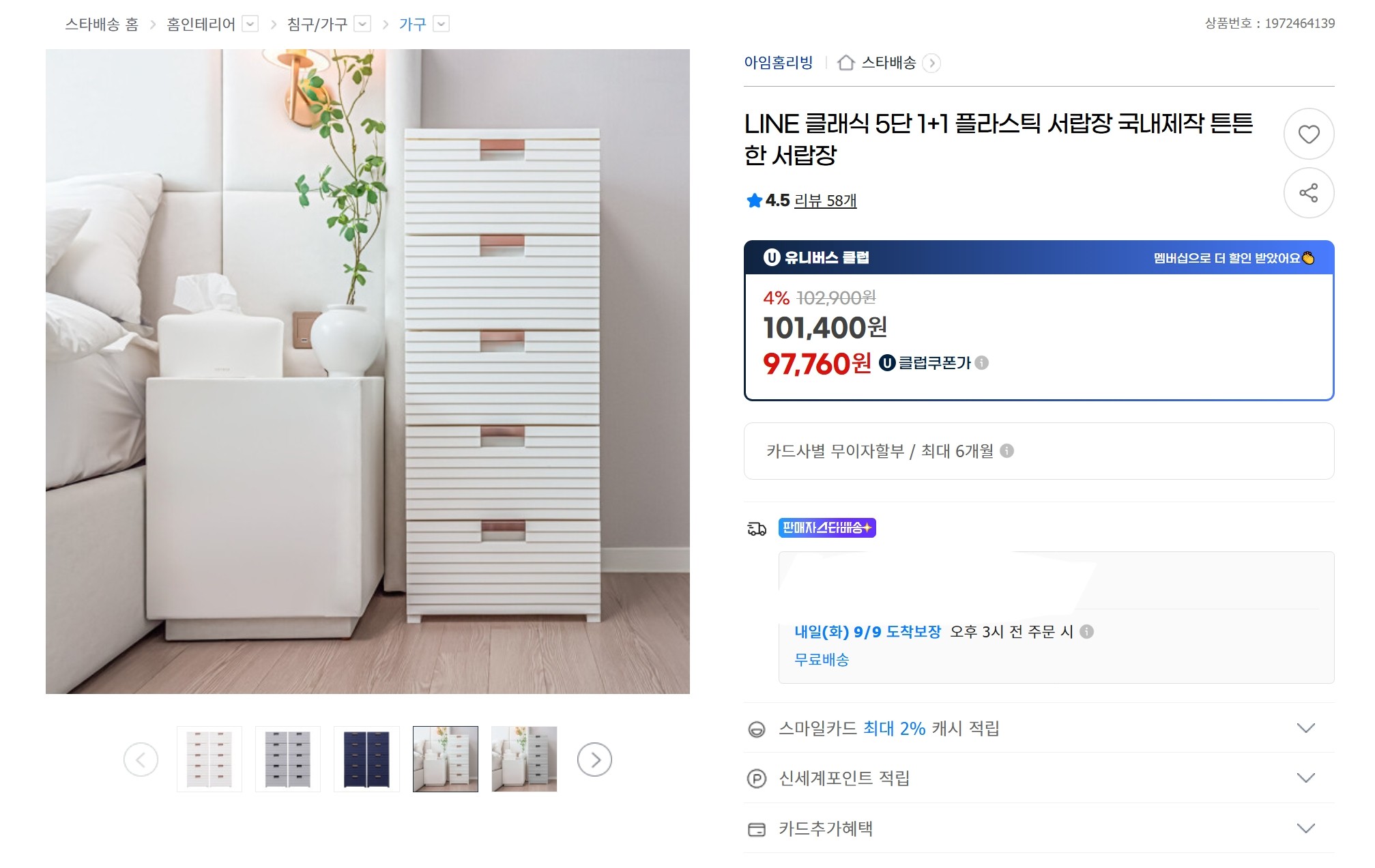 [지마켓] 국내제작 LINE 클래식 5단 1+1 플라스틱 서랍장 (97,760원/무배)