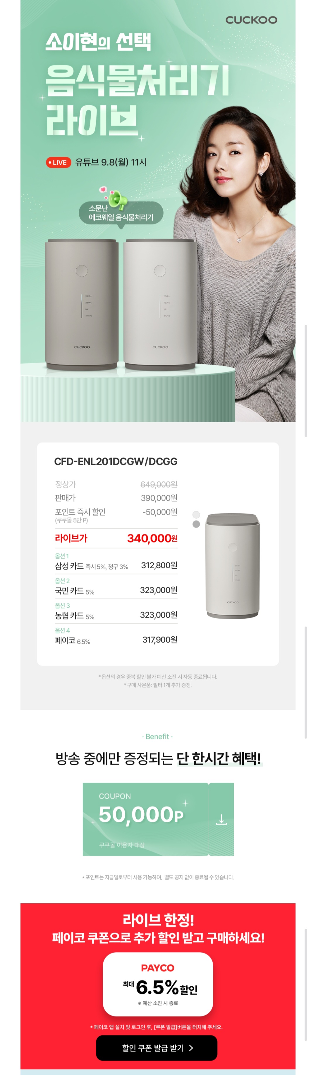 [쿠쿠몰] 쿠쿠 에코웨일 음식물처리기 라이브 (312,800원/무배)