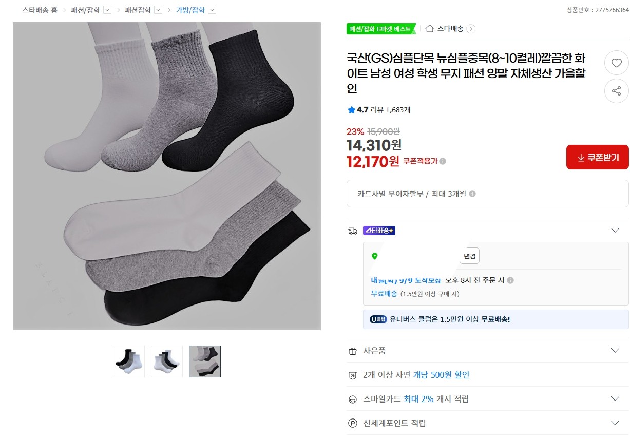 [지마켓] 국산(GS)심플단목 뉴심플중목(8~10켤레) (12,170원/무배)