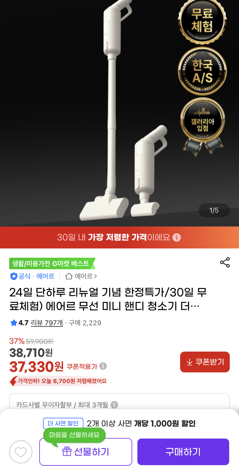 [지마켓]에어르 더 그램 무선 미니 핸디청소기 (37,330원/무료)