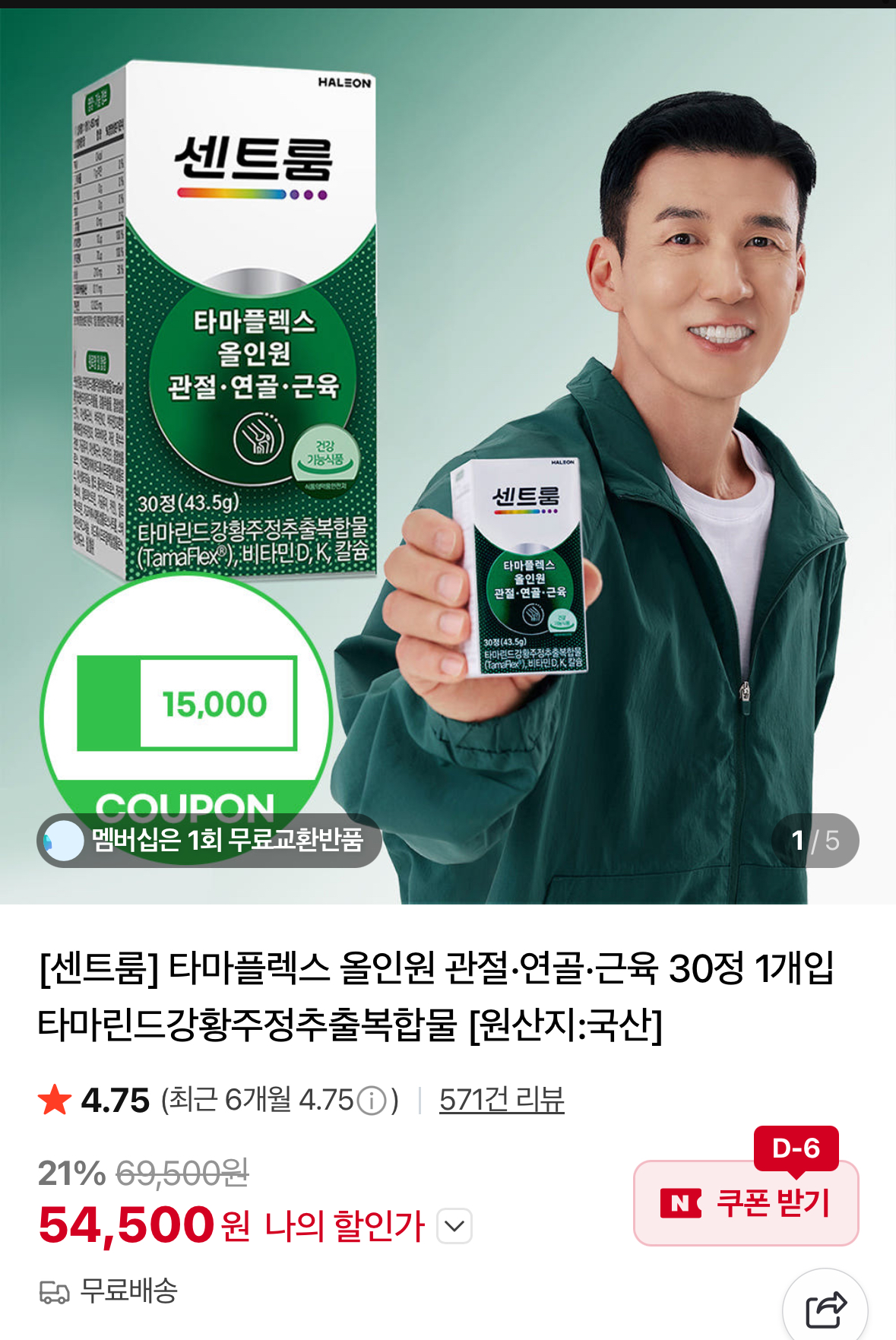 [네이버] 센트룸 타마플렉스 올인원 관절·연골·근육 30정 1개 (54,500원/무료)