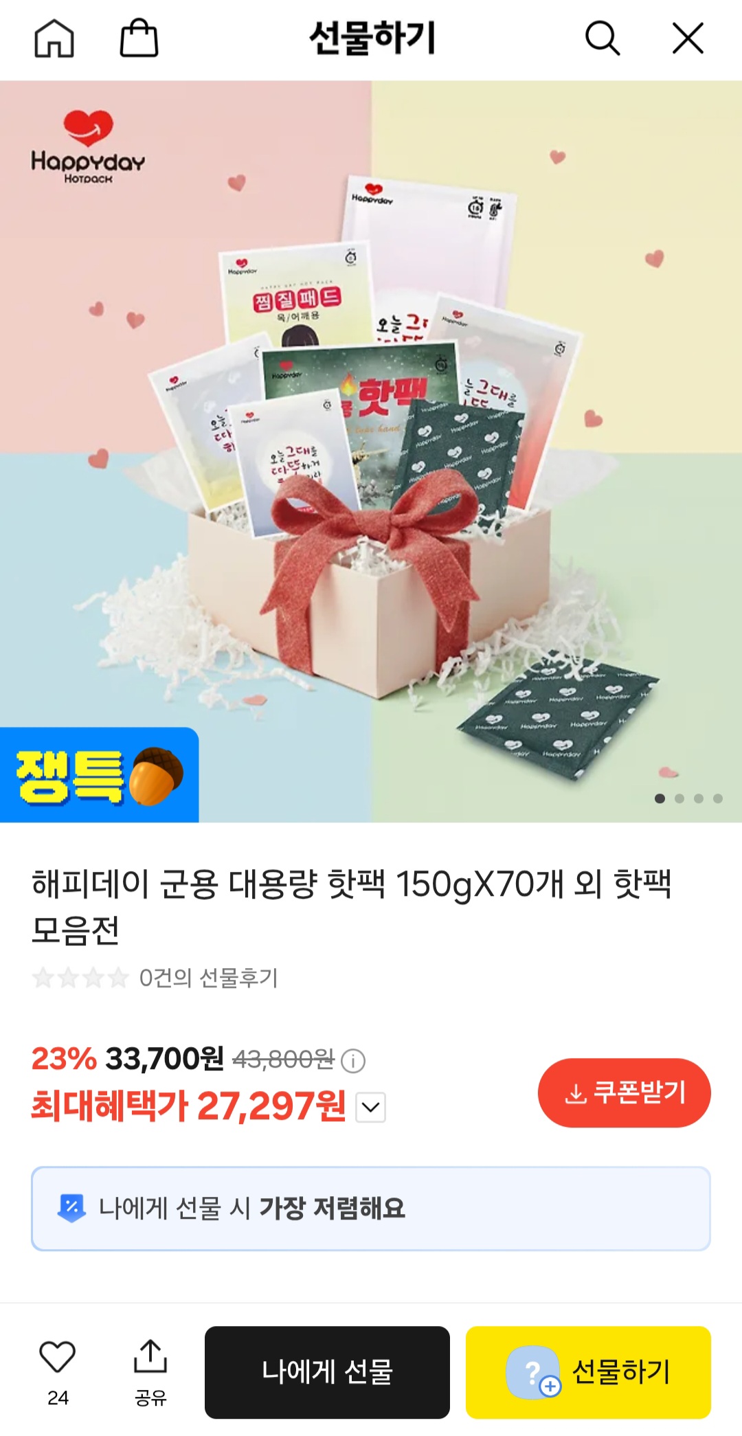 [카톡 선물하기] 군용 대용량 핫팩 150g X 70개 외 핫팩 모음전 (27,297원/무배)