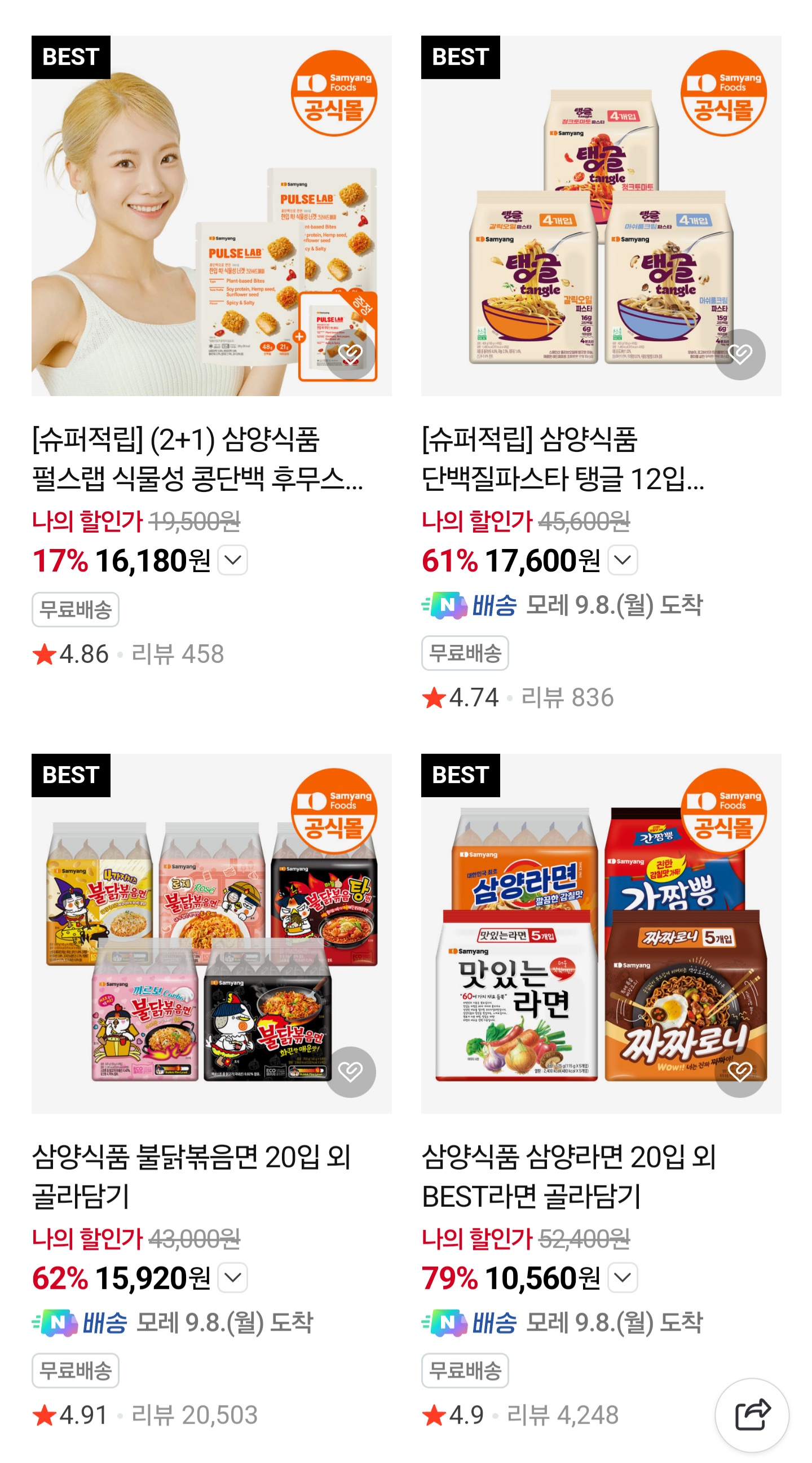 삼양 단백질 파스타, 불닭, 과자류까지 오늘만 추가 쿠폰주는걸로 전부 할인 중이에요