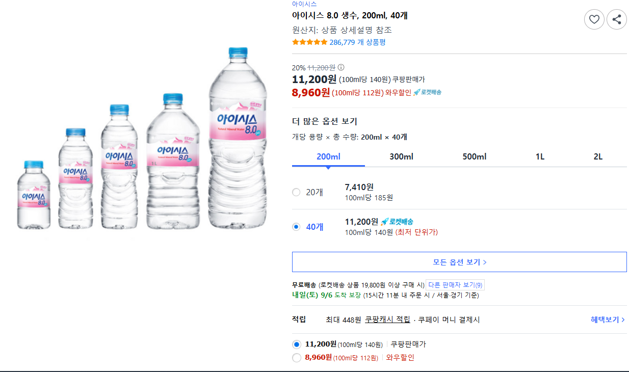 [쿠팡] 아이시스 8.0 생수, 200ml, 40개 (8,960원/무배)