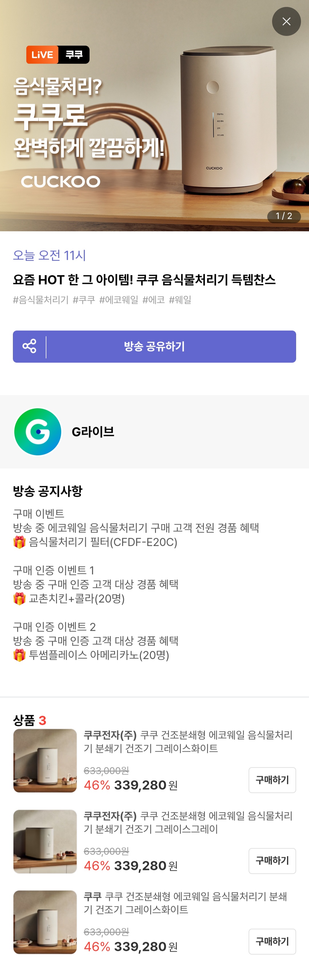 [지마켓] 쿠쿠 건조분쇄형 에코웨일 음식물처리기 라이브 할인 (339,280원/무배)