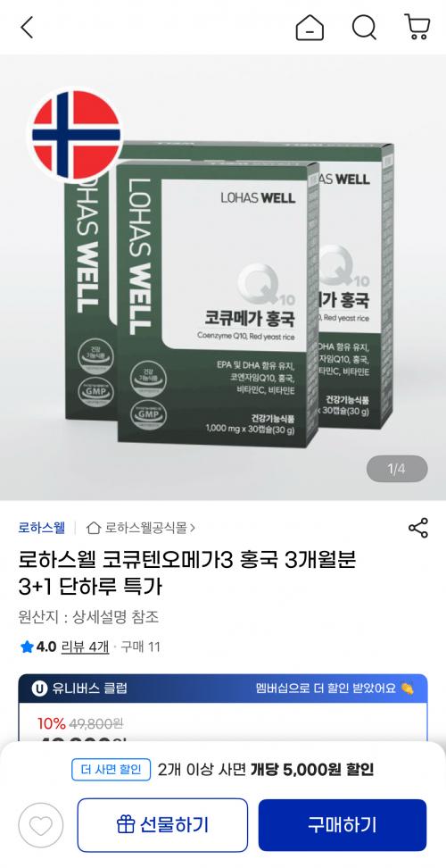 [지마켓] 로하스웰 코큐텐오메가3 홍국 3개월분 3+1 (49,800원/무료) > 국내핫딜