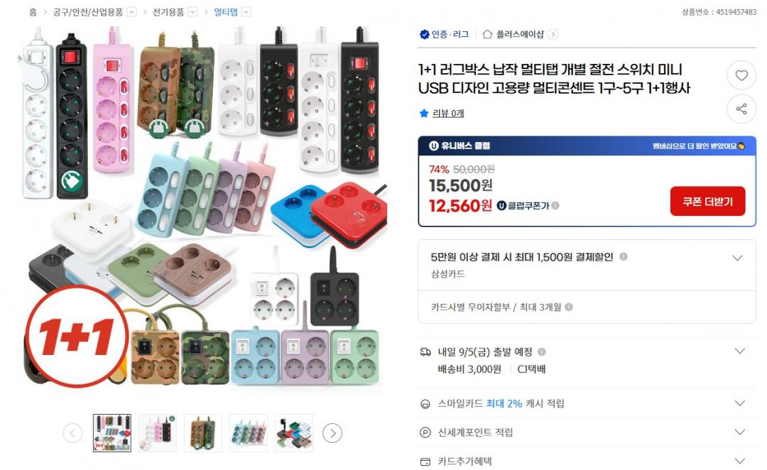 [지마켓] 러그박스 납작 멀티탭 개별 절전 스위치 미니 USB 디자인 고용량 멀티콘센트 1구~5구 1+1 (12,560원/3,000원) > 국내핫딜