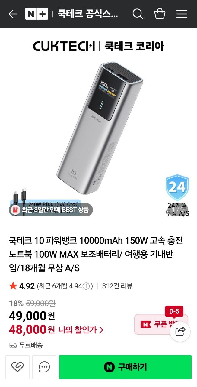 기내반입 보조배터리가 필요해서 급하게주문한건데