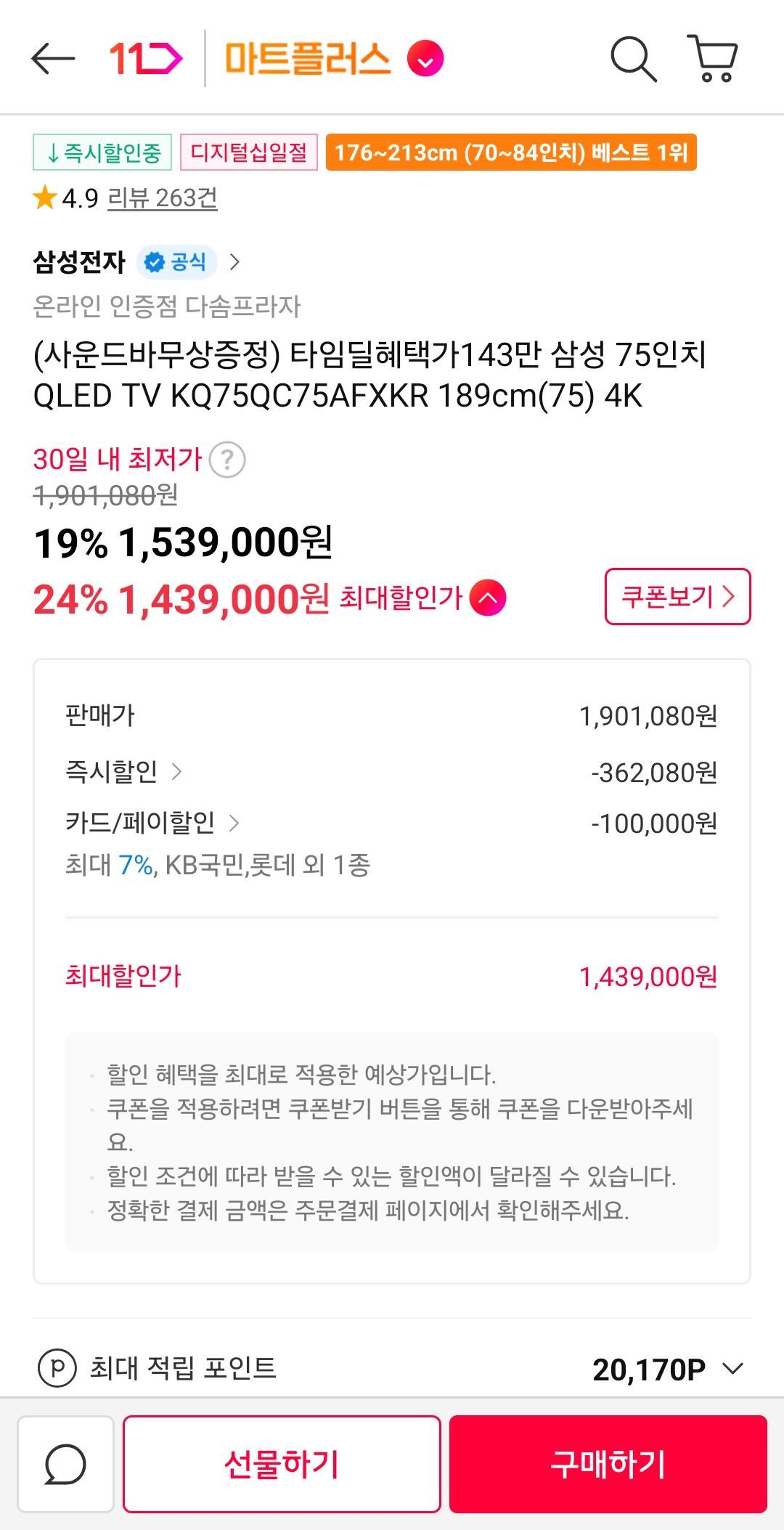 [11번가]삼성 75인치 QLED TV KQ75QC75AFXKR (1,439,000원/무료)